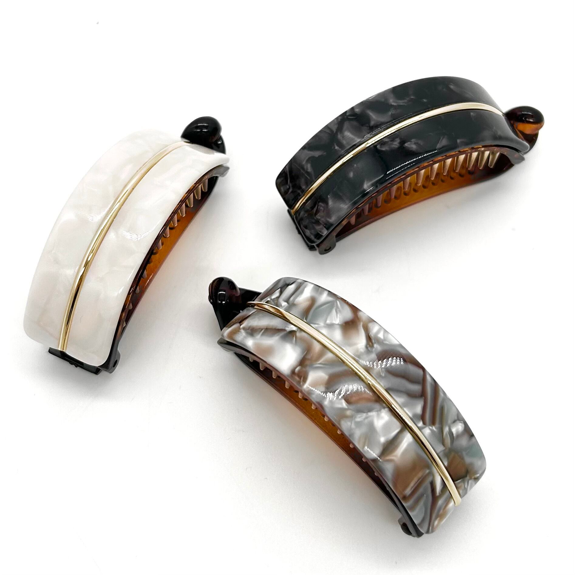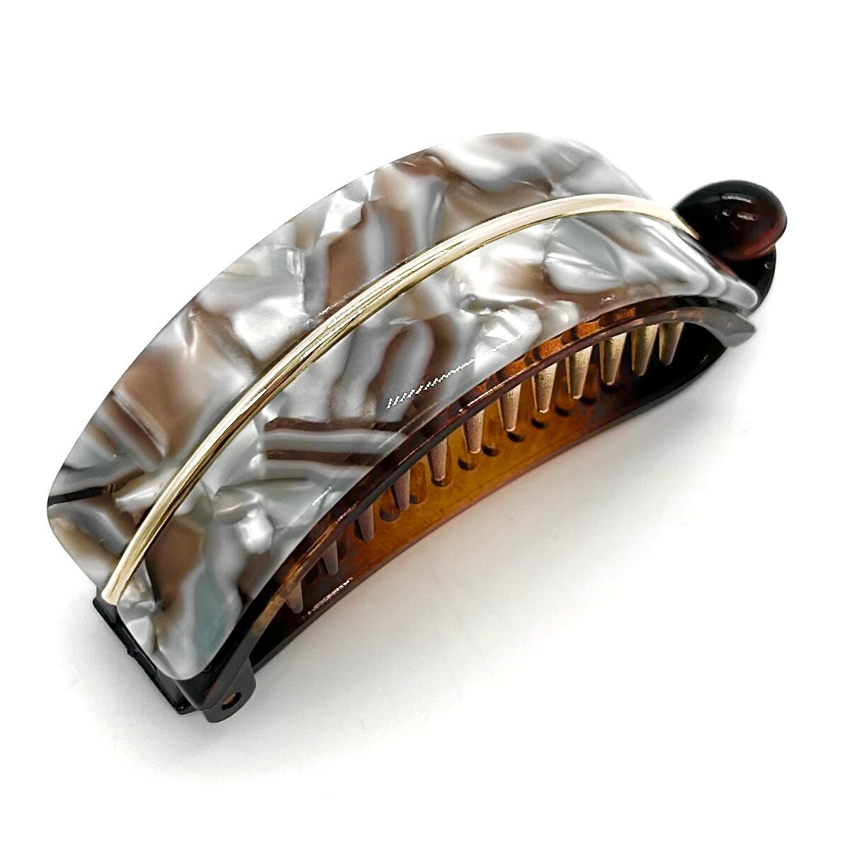 留める、その瞬間を美しく。 髪を優しく包み込み、軽やかにまといながらも、安定したホールド感を実現。 髪留めの新常識【Clappin】登場。 *商品説明* カラー / ホワイト、ブルー、ブラック サイズ / 全長:約7.8cm ★JapanMade ★パーツの特性上、写真の模様パターンとの違いがございます。